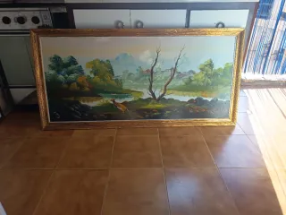 Precioso cuadro decorativo con un paisaje. - Marco de color dorado. - Tonos verdes predominantes en la escena.