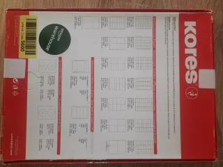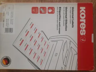 Caja de etiquetas universales Kores, ideales para impresoras inkjet, láser y copiadoras. El paquete contiene 2400 etiquetas. - Formato: 70 x 36 mm. - Color: Blanco. - Cantidad: 100 hojas / 2400 piezas. - Fabricado en Alemania.
