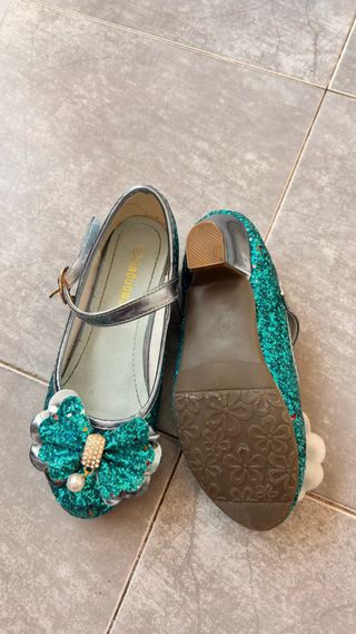 Preciosos zapatos de niña con temática Frozen, perfectos para ocasiones especiales. Talla 31 - Diseño brillante en color verde esmeralda. - Adorno de lazo con detalles dorados y perla. - Cierre de hebilla ajustable.