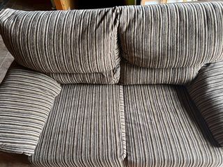 Sofá de dos plazas con un diseño de rayas verticales en tonos beige y marrón. Su tapicería es de tela, lo que le confiere un aspecto acogedor. - Diseño a rayas verticales. - Tapicería de tela.