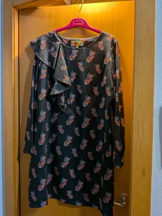Vestido con un estampado divertido y original. - Diseño con volantes en el hombro. - Manga larga. - Largo hasta la rodilla. - Depende de los complementos puede ser de diario o para vestir.