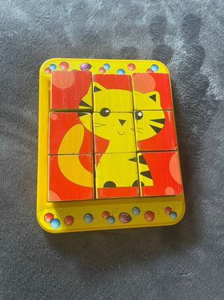 Divertido puzzle de madera. - Nueve cubos de madera para encajar. - Ilustraciones de un animales con fondo de colores