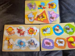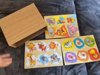 Set de puzzles de madera para niños con diseños de animales. - Incluye una caja de madera para guardarlos. - Varios puzzles con diferentes animales y formas. - Piezas con pomos para facilitar el agarre.