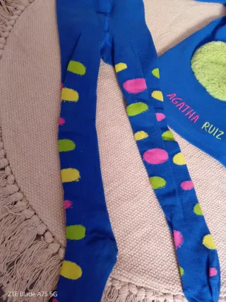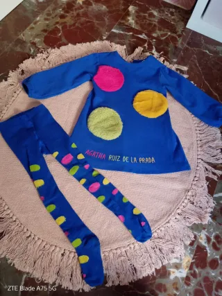Conjunto de vestido y leotardos de Agatha Ruiz de la Prada para bebé. El vestido es azul con círculos de colores. Nuevo talla 2-3 años - Vestido azul con apliques de círculos fucsia, amarillo y verde. - Leotardos azules con estampado de círculos de colores.