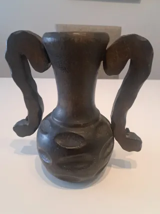 Este jarrón de madera tiene un diseño único con dos asas curvas. - Acabado en tonos oscuros. - Cuerpo con relieve circular.