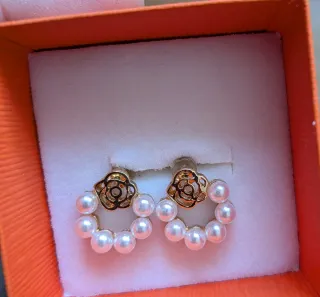 Elegantes pendientes con un diseño circular adornado con perlas y un detalle floral. - Círculo de perlas blancas. - Detalle superior en forma de flor dorada.
