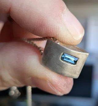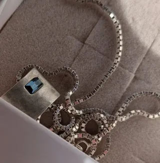 Elegante colgante con cadena de plata y un detalle de piedra azul rectangular. - Diseño moderno y minimalista. - Cadena tipo caja. - Piedra central facetada.