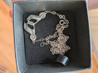 Elegante colgante con un diseño de manos entrelazadas que sostienen una piedra azul y un detalle brillante. - Diseño de manos. - Detalle de piedra azul y brillante. - Plata 925