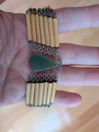 Collar artesanal con cuentas de madera y un colgante central. - Cuentas de madera en tono beige. - Colgante central con piedra en forma de lágrima de color verde. - Cierre de gancho. - Ajuste al cuello. Como los indios nativos norteamericanos.