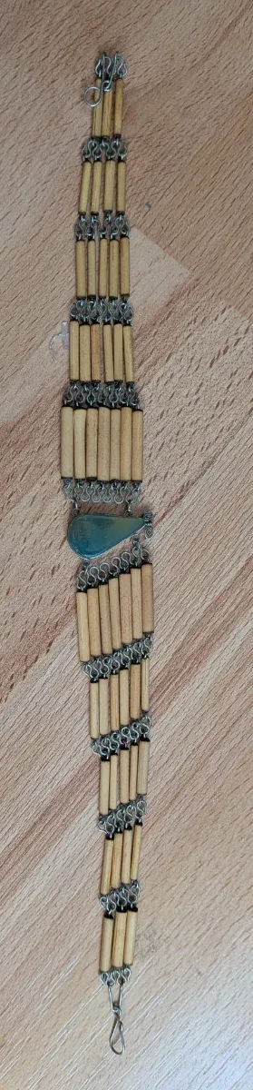 Collar artesanal con un diseño llamativo y colorido. - Cuentas de madera y elementos de hueso. - Cierre de cordón ajustable. - Piezas colgantes en forma de abanico y formas geométricas. - Hecho a mano en país de origen.