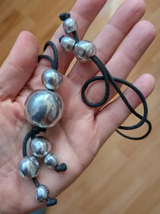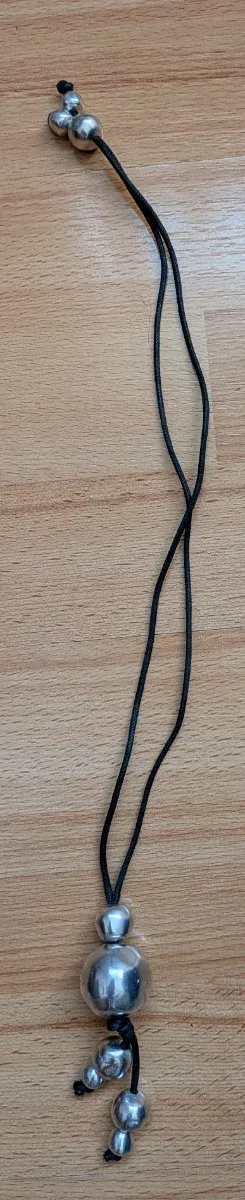 Colgante con un diseño moderno y elegante. - Cuentas de metal en tono plateado. - Cordón negro para colgar.