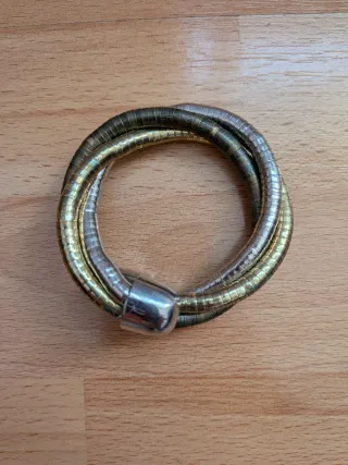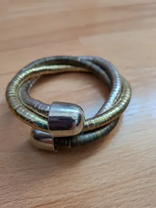 Elegante pulsera con un diseño flexible que imita la forma de una serpiente. Combina tonos dorados y plateados para un look sofisticado. - Diseño flexible tipo serpiente. - Acabado bicolor: dorado y plateado.