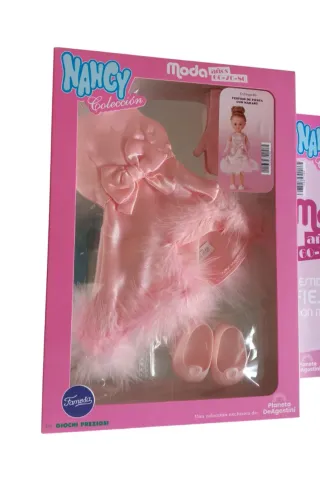 Completo en su caja original. Con certificado de autenticidad. Con catálogo. Vestido de Fiesta con marabú. N° 89 de la Colección Moda para Nancy años 60, 70 y 80. Vestido ceñido con plumas marabú, guantes y zapatos de botón rosas. Nuevo sin estrenar. Estado impecable.