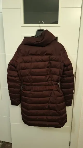 Abrigo plumífero con un diseño elegante y moderno. - Color marrón. - Talla 40 - Cinturón ajustable con detalle dorado. - Cremallera frontal dorada. - Cuello alto con solapa ancha.
