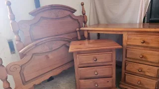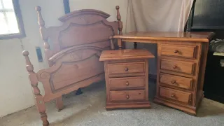 Conjunto de muebles de dormitorio de madera, ideal para una cama de 105 cm. - Cabecero de madera con detalles ornamentales. - Mesita de noche de tres cajones. - Escritorio con cuatro cajones.