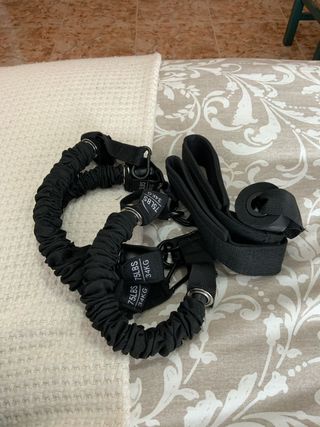 Kit de bandas elásticas para entrenamiento en casa. Incluye dos bandas con agarres y una correa para tobillo. - Bandas elásticas negras. - Indicación de peso: 75 LBS / 34 KG en cada banda. - Correa de tobillo ajustable.