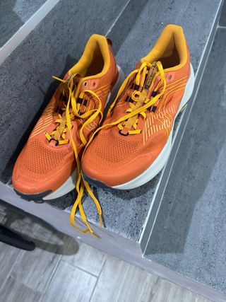 NUEVAS Zapatillas de running Saucony Xodus Ultra 4 en color naranja. - Diseño deportivo y moderno. - Cordones amarillos. - Suela blanca y negra.