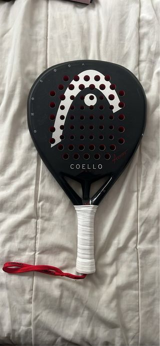 Pala de pádel Head Coello del año 2025. Ha sido utilizada en dos ocasiones. - Color negro con detalles en blanco y rojo. - Logo de Head en blanco. - Nombre 'COELLO' en la cara. - Grip blanco y cordón de seguridad rojo.