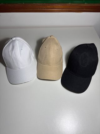 Conjunto de tres gorras básicas y cómodas. Sin uso. Ideal para combinar con otras prendas - Gorra blanca. - Gorra beige. - Gorra negra.