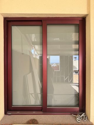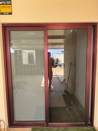 Puerta corredera (1.8x2.1m) / ventana (1x1.2m) / puerta exterior (1x1.8m). - Marco de aluminio color burdeos. - Dos paneles de vidrio. - Ideal para exteriores.