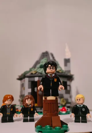 Pack de minifiguras de HP: hp468 Hermione. Uniforme Gryffindor.(Primera vez que salió 2024). hp281 Harry Potter. Uniforme Gryffindor (Primera vez que salió 2001). hp283 Ron Weasley. Uniforme Gryffindor. (Primera vez que salió 2001). hp254 Draco Malfoy. Uniforme Slytherin (Primera vez que salió 2020). No se venden sueltas. Se prepara en bolsita de plástico individualmente con cada minifigura. Lego original. Escenario decoración (cabaña Hagrid no en venta). Venta en persona entre el Realejo/Icod. Se puede estudiar el envío también.