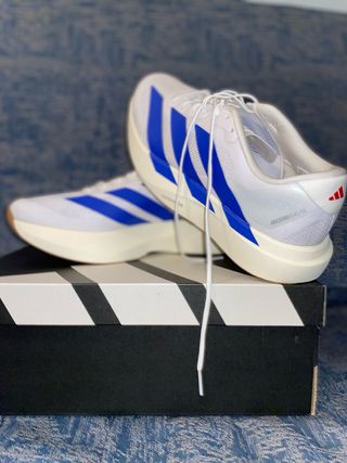 Zapatillas de running Adidas Adizero Evo SL en color blanco y azul. Diseñadas para ofrecer un rendimiento óptimo. - Diseño deportivo con detalles en azul. - Suela de goma para mayor tracción. - Cierre con cordones.
