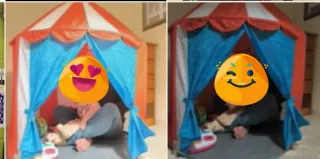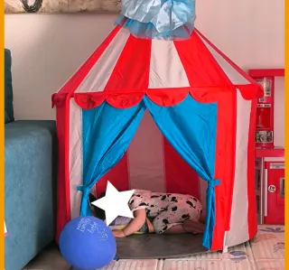 Tienda de juegos con forma de circo de Ikea. Ideal para que los niños jueguen y se diviertan. - Diseño de circo con rayas rojas y blancas. - Cortinas azules que se pueden atar.
