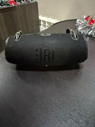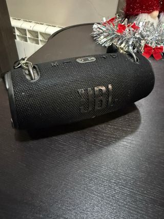 Altavoz portátil de la marca JBL en color negro. Diseño cilíndrico con acabado en tela. - Asa para transporte. - Botones de control en la parte superior.