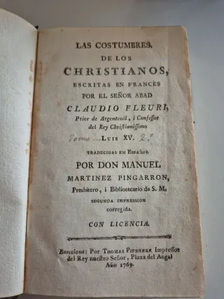 Libro antiguo titulado Las costumbres de los christianos de Claude Fleury, traducido por Manuel Martínez Pingarrón e impreso en Barcelona en 1769. Título original: Las costumbres de los christianos. Autor: Abad Claudio Fleuri. Traductor: Don Manuel Martínez Pingarrón, presbítero y bibliotecario de S. M. Impresión: Segunda impresión corregida, por Thomas Piferrer, en Barcelona. Año: 1769.l objeto es un libro antiguo titulado Las costumbres de los christianos de Claude Fleury, traducido por Manuel Martínez Pingarrón e impreso en Barcelona en 1769. Título original: Las costumbres de los christianos. Autor: Abad Claudio 296 páginas