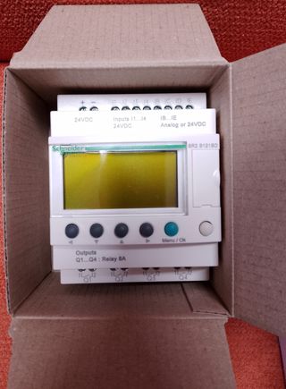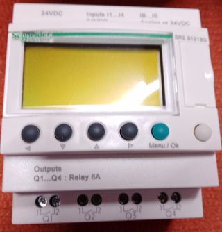 Módulo programable Zelio de Schneider Electric, modelo SR2B121BD. - Alimentación 24VDC. - 8 entradas, 4 digitales y 4 con opción 0-10Volt - Salidas Q1...Q4: Relay - Pantalla LCD. Con aplicación para el control de 2 Bombas achique, residuales, pluviales, entrada para 2-3 boyas, estado protección bombas, salidas para accionamiento contactores, alarma nivel máximo, exceso tiempo de marcha, defecto de bombas, defecto boyas. funcionamiento con alternancia de bombas, discriminación en caso de fallo. Registro de horas de marcha y número de maniobras para cada bomba, pantalla LCD. Ideal para mejorar cuadros existentes o incluir en