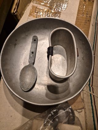 Conjunto de cuenco y taza de estilo militar, fabricados en aluminio. - Cuenco de gran tamaño. - Taza con asa. - Diseño práctico y resistente. - Cuchara