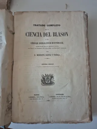 Tratado completo sobre la Ciencia del Blason, segunda edición. - Título: Tratado Completo de la Ciencia del Blason o sea Código Heráldico-Histórico. - Autor: D. Modesto Costa y Turell. - Edición: Segunda, corregida y considerablemente aumentada. - Publicado en Madrid y Barcelona en 1858.