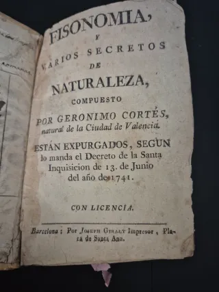Libro antiguo sobre Fisonomía y secretos de la naturaleza. - Compuesto por Geronimo Cortés. - Natural de la Ciudad de Valencia. - Expurgado según decreto de la Santa Inquisición de 13 de Junio de 1741. - Con licencia. - Impreso en Barcelona por Joseph Giralt. 260 páginas