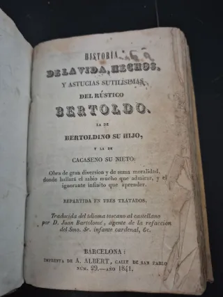 Libro antiguo Historia de la vida, hechos y astucias sutilísimas del rústico Bertoldo. - Obra de gran diversión y suma moralidad. - Traducida del idioma toscano al castellano. - Publicado en Barcelona por A. Albert en 1841. 283 páginas