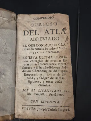 Este compendio ofrece una visión abreviada y curiosa del Atlas. - Contiene noticias claras de todo el mundo y cosas inventadas. - En esta última impresión se han corregido erratas y añadido una adición cronológica de Papas, Emperadores, Reyes de España y Origen de las Religiones. - Por el Licenciado Ginés Campillo, Presbítero. - Con licencia. - Impreso por Joseph Tolosa.