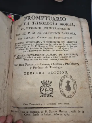 El texto es la portada de un libro antiguo titulado Promptuario de la Theología Moral, que detalla su autoría y edición. Título: Promptuario de la Theología Moral. Autor original: P. M. Fr. Francisco Larraga, reformado por Don Francisco Santos, y Grosin. Edición: Tercera edición. Fecha y lugar: Madrid, Año de 1789 736 páginas