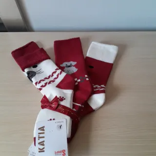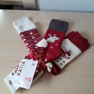 Pack de tres pares de calcetines altos para Mujer térmicos. Muy suaves y cómodos de poner. 95% algodón 5% elastán. Dibujos varios. Número 35/40 🧦. Precio == 5 euros. - Diseño con motivos navideños. - Talla 35-40. - Tejido térmico.