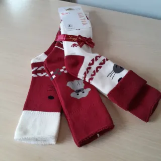 Pack de tres pares de calcetines térmicos con divertidos diseños. Son altos, térmicos y muy agradables de llevar. Tonos granate, beige. 95% algodón 5% elastán. Número 35/40 🧦. Precio == 5 euros. - Diseños variados. - Tejido suave y confortable. - Ideales para mantener los pies calientes.