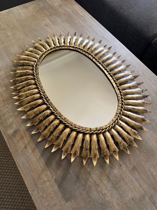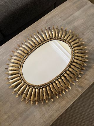 Espejo sol antiguo dorado forjado. Ovalado, color dorado. Años 60. Medidas: Alto - 60 cm Ancho - 46 cm Fondo - 2 cm