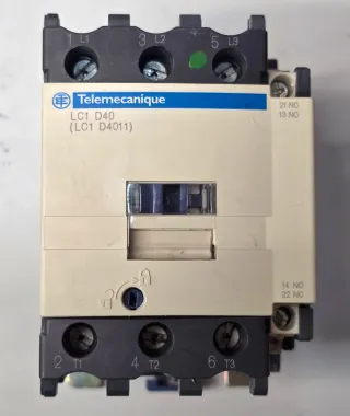 Contactor Telemecanique LC1 D40. - Modelo: LC1 D40 (LC1 D4011). - Marca: Telemecanique. - Terminales L1, L2, L3. - Terminales T1, T2, T3. - Contactos auxiliares: 21 NC, 13 NO, 14 NO, 22 NC. ☆ 2 unidades disponibles; precio por unidad. ■ En perfecto estado de funcionamiento y estético.