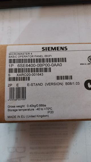 Panel operador Siemens Micromaster 4. - Modelo: 6SE6400-0BP00-0AA0 - Tipo: Basic Operator Panel (BOP) - Versión: B08/1.03 - Peso bruto: 0.40kg/0.88lbs - Temperatura de almacenamiento: -40 a +70°C - Protección IP20 - Fabricado en la UE (Reino Unido)