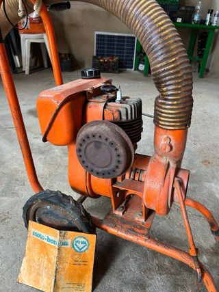 Motobomba Piva de color naranja, ideal para diversas tareas. - Manguera flexible incluida. - Ruedas para facilitar el transporte. - Manual de instrucciones original. 2caballos y prensa nuevo muy dificil de encontrar un motor en ese estado con pintura original