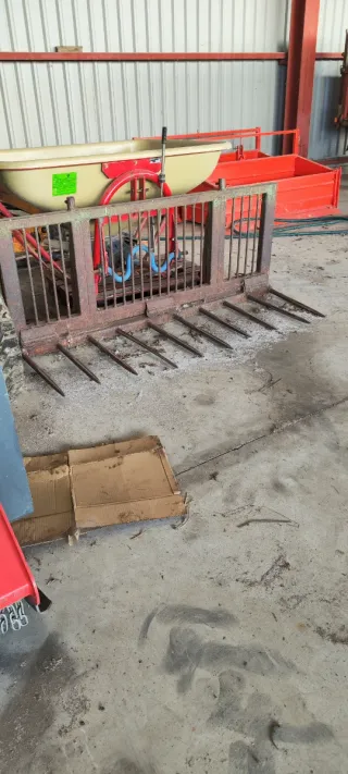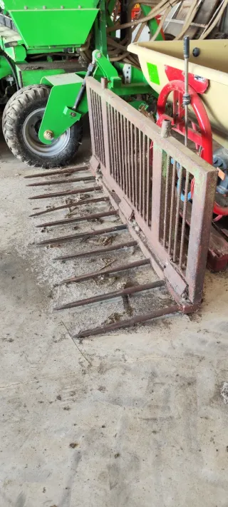 Set de pinchos para bolas de heno o paja, diseñados para uso agrícola. - Nuevos. - Enganche universal. - Estructura metálica robusta. - Incluye dos pinchos principales y soportes. - Ideal para tractores y maquinaria agrícola. - Precio sin IVA