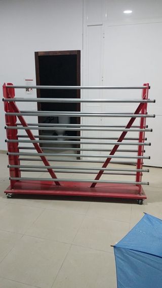 Este soporte está diseñado para organizar y almacenar rollos de diversos materiales. - Estructura metálica robusta. - Múltiples barras horizontales para rollos. - Base con ruedas para facilitar el desplazamiento.