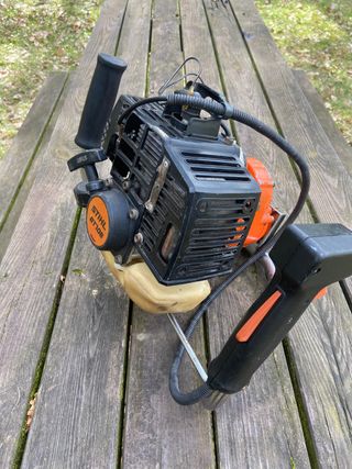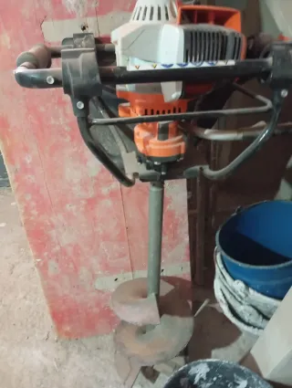 Sinfín térmico Potente ahoyadora de un usuario para profesionales. Para perforar agujeros de hasta 300 mm de diámetro Amortiguador de vibraciones con pulsador Stop integrado en el manillar. Con freno taladro STIHL QuickStop, que en caso de giro del usuario se para la máquina Fabricada en marzo del 2021 Comprada en el 2022 Con poco uso En buen estado general Funciona bien Cilindrada: 36,3 cm3, Potencia 1,4 KW Peso solo de la máquina: 10 kg (sin broca), Nivel sonoro: 92 dB Motor a gasolina 2 tiempos Capacidad del depósito de combustible: 0,71 litros Viene con broca de acero de 9 cms 90 mm de diámetro 69,5 cms de alto no negociable