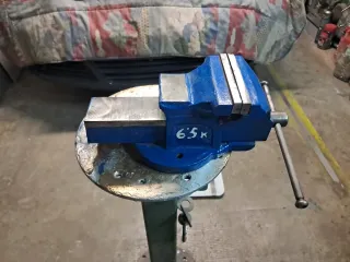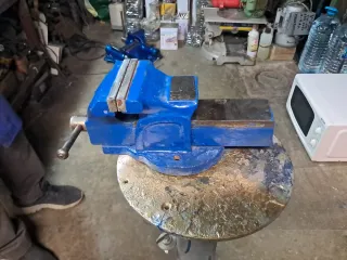 Tornillo de banco de color azul, ideal para sujetar piezas - Medidas de la base: 59 x 59 mm.