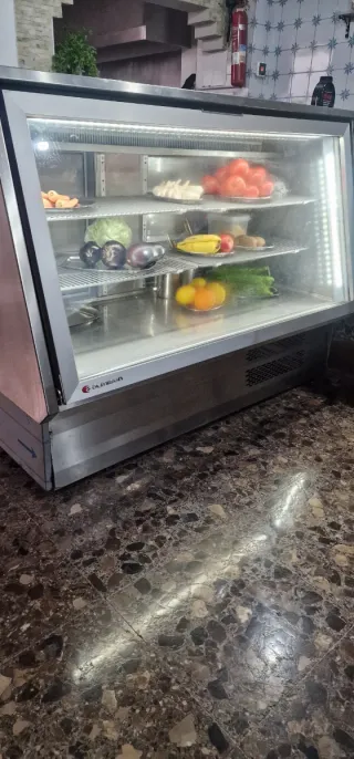 Vitrina refrigerada de acero inoxidable, ideal para exponer alimentos en un restaurante o negocio. - Diseño moderno y funcional. - Estantes interiores para organización. - Iluminación LED integrada.