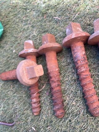 11 tornillos de ferrocarril. - Material: Acero - Color: Óxido.