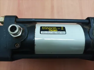 Cilindro neumático marca Trinorm, modelo 2. - Cuerpo de cilindro en color blanco y negro. - Conexiones para aire. - Montaje con varillas y tuercas.