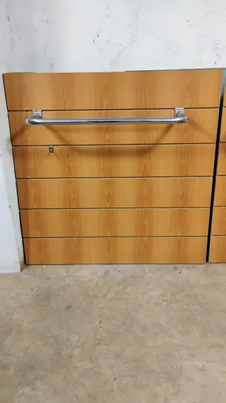 Se venden paneles expositores de madera para tienda. Son ideales para organizar y mostrar productos. Medida 120x120 cm. - Diseño de listones horizontales. - Barra metálica superior.